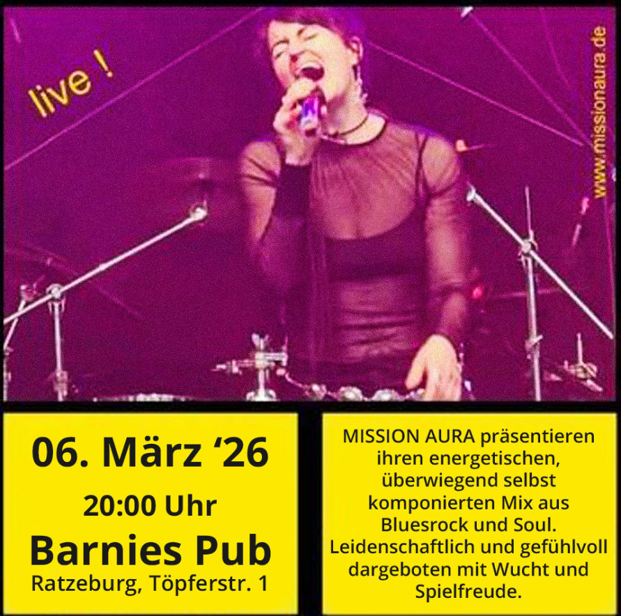 Mission Aura präsentieren ihren energetischen, überwiegend selbst komponierten Mix aus Bluesrock und Soul. Leidenschaftlich und gefühlvoll dargeboten mit Wucht und Spielfreude.